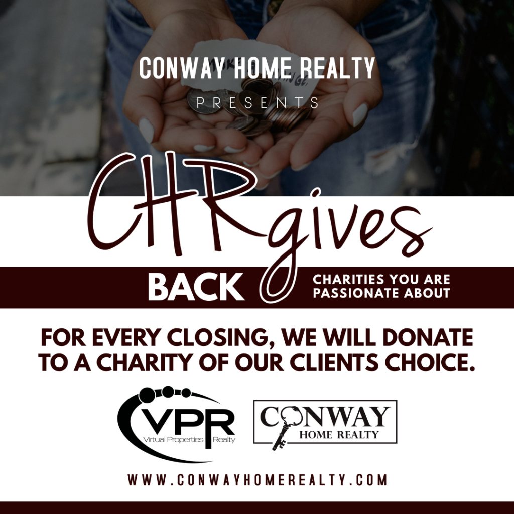 For every $100,000 in sale price, Conway Home Realty will donate $100 to the charity of our clients’ choice. Help us spread the wealth to organizations that are near and dear to our hearts.